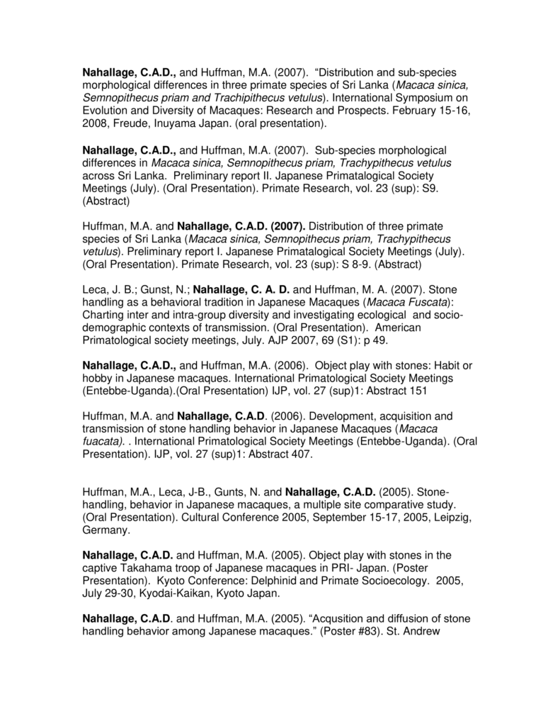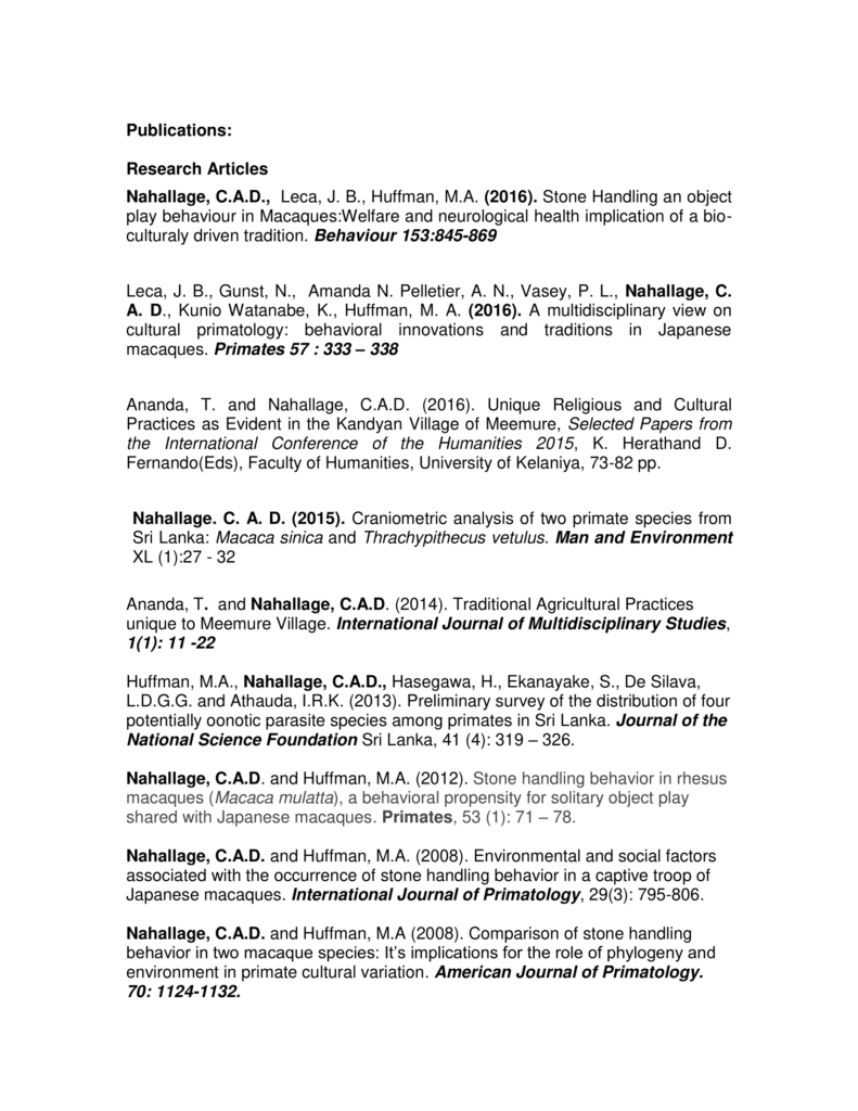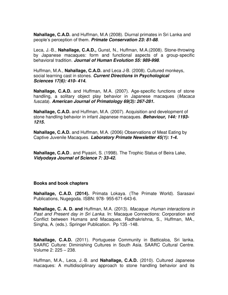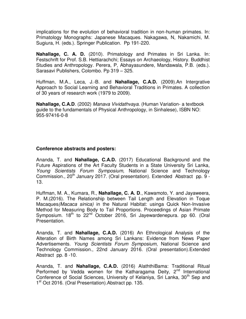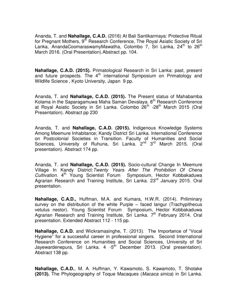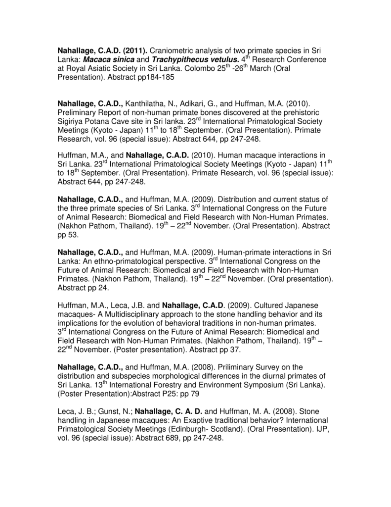 Prof. Charmalie A.D. Nahallage is a leading Sri Lankan primatologist and Professor of Anthropology at the University of Sri Jayewardenepura. Her research bridges primate cultural behaviors, fossil studies, and ethnoprimatology, with field experience across Sri Lanka, Japan, India, and Indonesia. She is internationally recognized for her pioneering work on stone handling in macaques, advancing understanding of cultural traditions and behavioral transmission in non-human primates. She holds an M.Sc. and D.Sc. from Kyoto University and served as adjunct faculty at the National Institute of Advanced Studies, India. She has received prestigious awards, including the Mombukagakusho Award, Commonwealth Fellowship. She has published widely on primate behavior and human-primate interactions, contributing to conservation-focused research in South Asia.Her current work includes countrywide primate surveys in Sri Lanka, studies on fossil primate bones from prehistoric sites, and bio-cultural research with the Ceylon Kaffir community. As Directress of the Multidisciplinary Research Centre at her university, she actively fosters research capacity and promotes conservation-oriented science, mentoring the next generation of researchers. Prof. Nahallage’s interest in exploring primate culture and its conservation relevance continues to inspire students and researchers globally, making her a respected voice in Asian primatology.