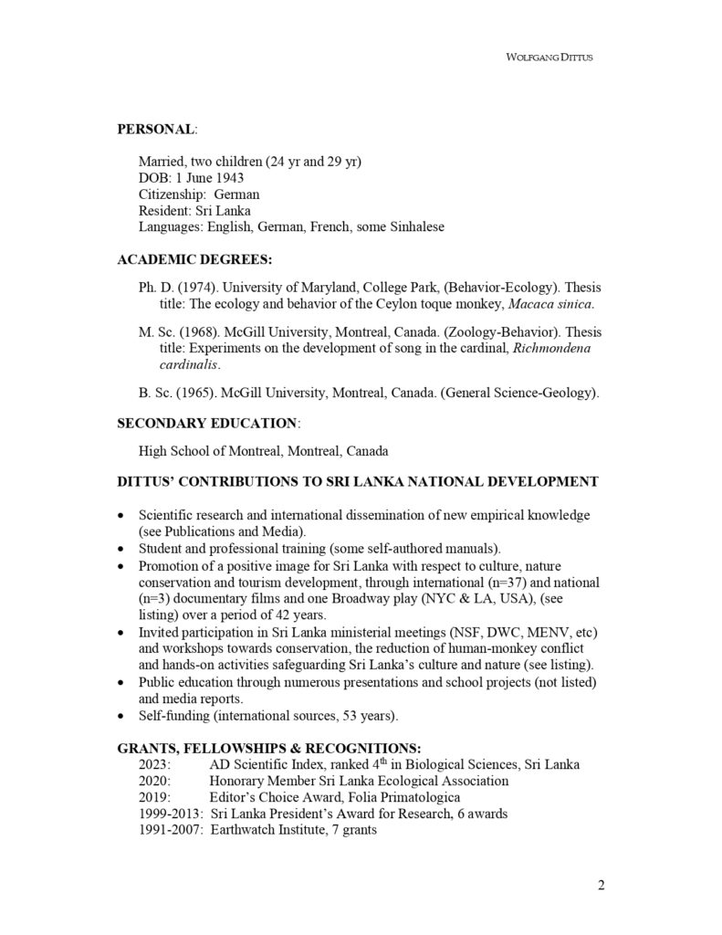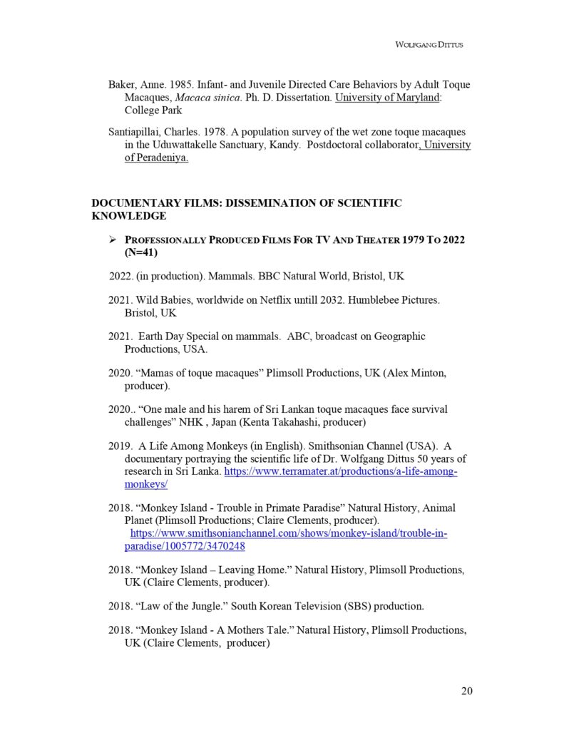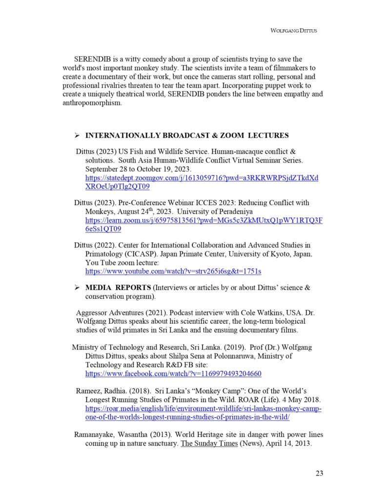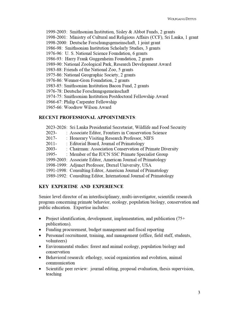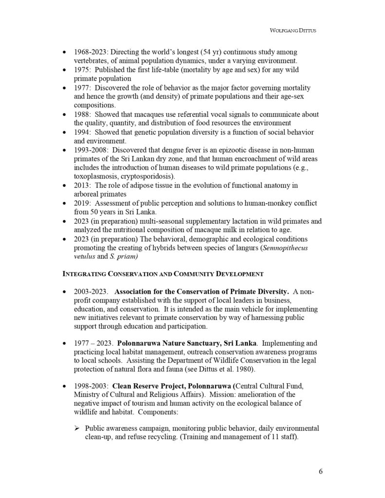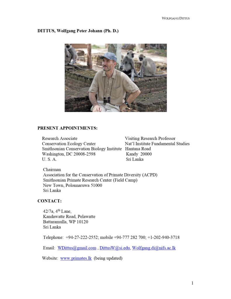 Through the Smithsonian Primate Biology Program (Sri Lanka) he aims to advance scientific knowledge for better understanding of the evolution of primate society and man’s place in nature, as well as for conserving wildlife. It provides insights of the many-sided nature of primate adaptations and the environmental context in which they evolved. The studies involve many collaborators from different disciplines, and have been ongoing continuously for over 54 years at a site of natural dry evergreen forest, the Polonnaruwa Nature Sanctuary and Archaeological Reserve, in the dry zone of Sri Lanka. Studies span the four sympatric primates there: Toque Macaque (Macaca sinica), Gray Langur (Semnopithecus priam), Purple-faced Langur (S. vetulus), and Slender Loris (Loris lydekkerianus); and these species’ demography (births, deaths, emigrations) in relation to social behavior, ecology, environment, and other facets of life are monitored. Published topics include behavioral ecology, growth and development, morphology, population genetics, paternity, social behavior, vocal communication, forest ecology, epidemiology, physiology, and conservation among others. New scientific discoveries feature in publications, and outreach educational programs to local schools and institutions. More than 40 documentary films based on the studies reach global audiences and includes the movie theater film “Monkey Kingdom” (produced with Disney Nature), as well many TV productions on the BBC, Discovery, Animal Planet, Smithsonian Channel, Rupavahini, and others. To promote the programmer’s aims, Dr Dittus and colleagues have established a non-profit company, the Association for the Conservation of Primate Diversity. See details of research program, publications and media outputs on the website www.primates.lk.