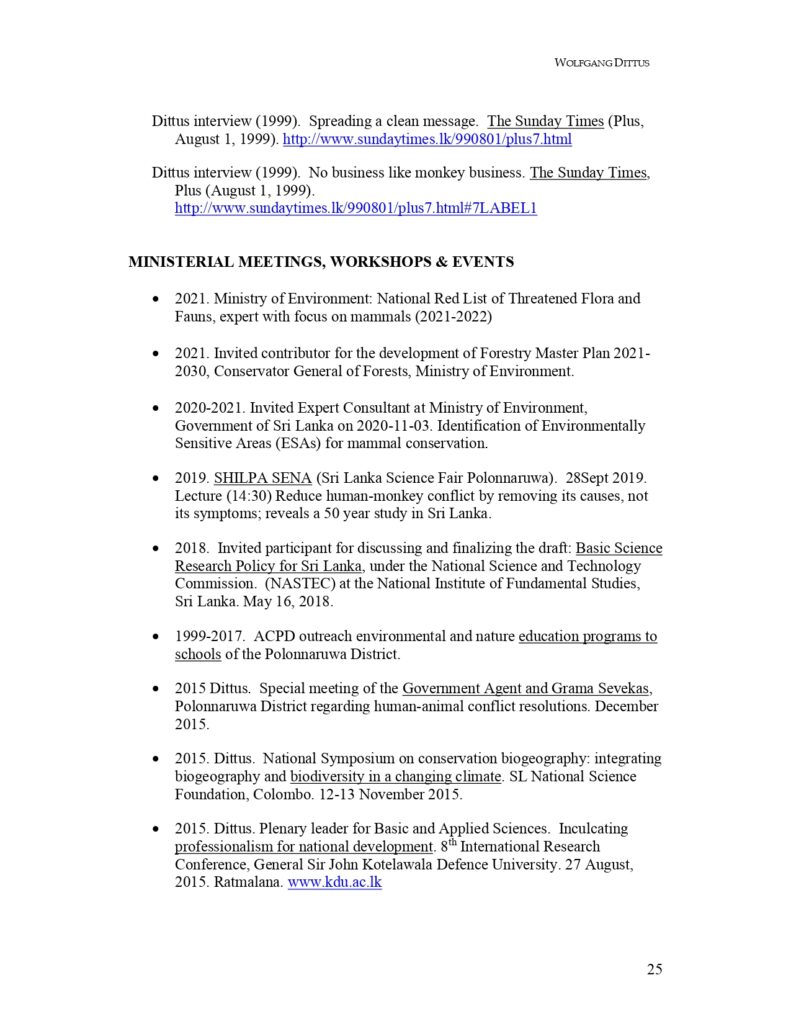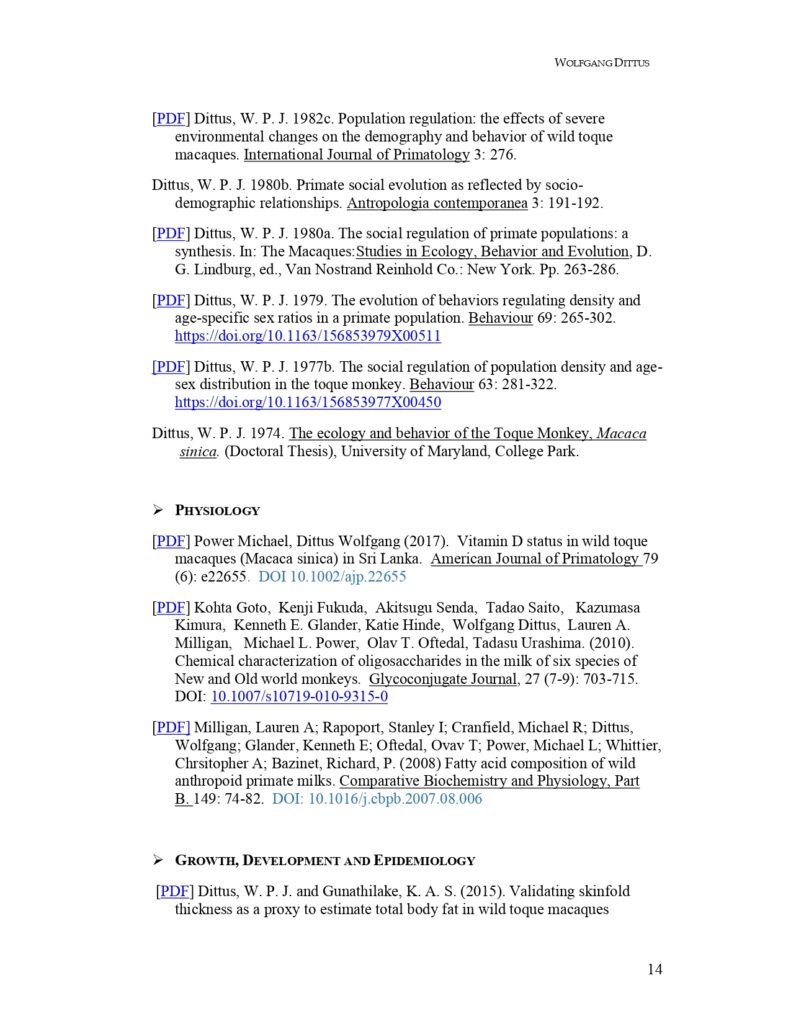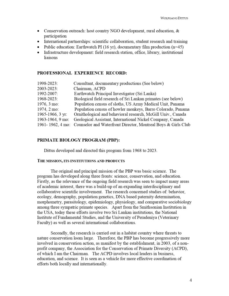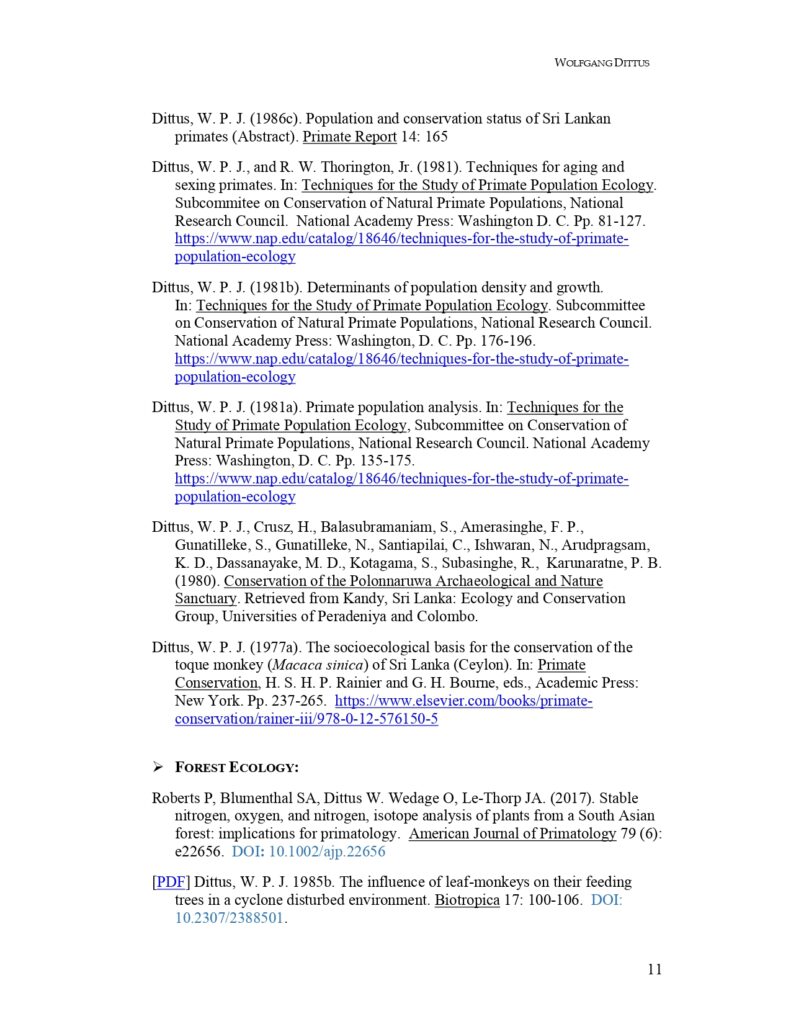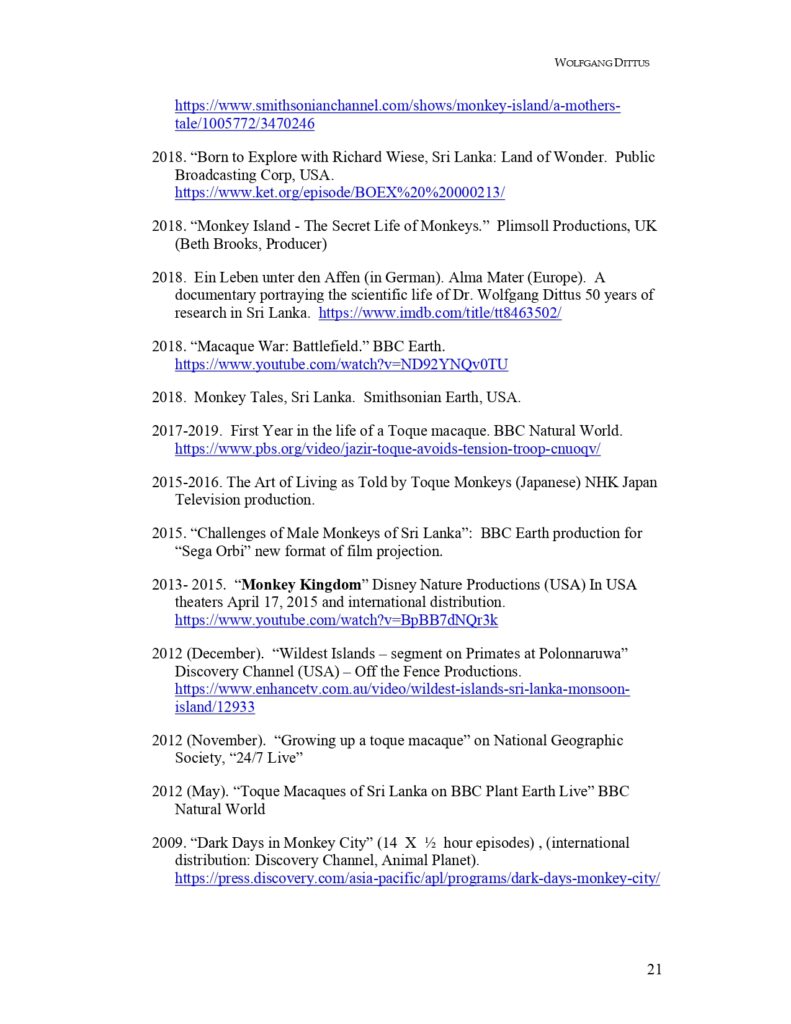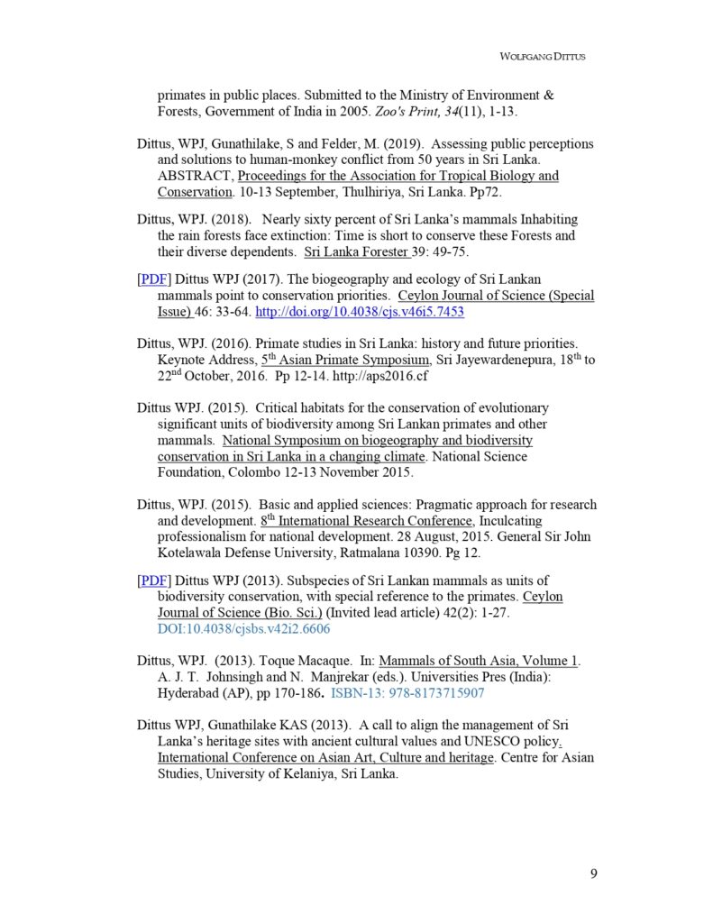 Through the Smithsonian Primate Biology Program (Sri Lanka) he aims to advance scientific knowledge for better understanding of the evolution of primate society and man’s place in nature, as well as for conserving wildlife. It provides insights of the many-sided nature of primate adaptations and the environmental context in which they evolved. The studies involve many collaborators from different disciplines, and have been ongoing continuously for over 54 years at a site of natural dry evergreen forest, the Polonnaruwa Nature Sanctuary and Archaeological Reserve, in the dry zone of Sri Lanka. Studies span the four sympatric primates there: Toque Macaque (Macaca sinica), Gray Langur (Semnopithecus priam), Purple-faced Langur (S. vetulus), and Slender Loris (Loris lydekkerianus); and these species’ demography (births, deaths, emigrations) in relation to social behavior, ecology, environment, and other facets of life are monitored. Published topics include behavioral ecology, growth and development, morphology, population genetics, paternity, social behavior, vocal communication, forest ecology, epidemiology, physiology, and conservation among others. New scientific discoveries feature in publications, and outreach educational programs to local schools and institutions. More than 40 documentary films based on the studies reach global audiences and includes the movie theater film “Monkey Kingdom” (produced with Disney Nature), as well many TV productions on the BBC, Discovery, Animal Planet, Smithsonian Channel, Rupavahini, and others. To promote the programmer’s aims, Dr Dittus and colleagues have established a non-profit company, the Association for the Conservation of Primate Diversity. See details of research program, publications and media outputs on the website www.primates.lk.
