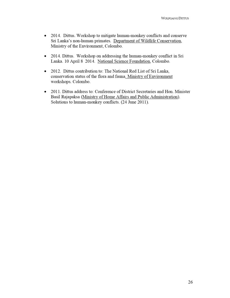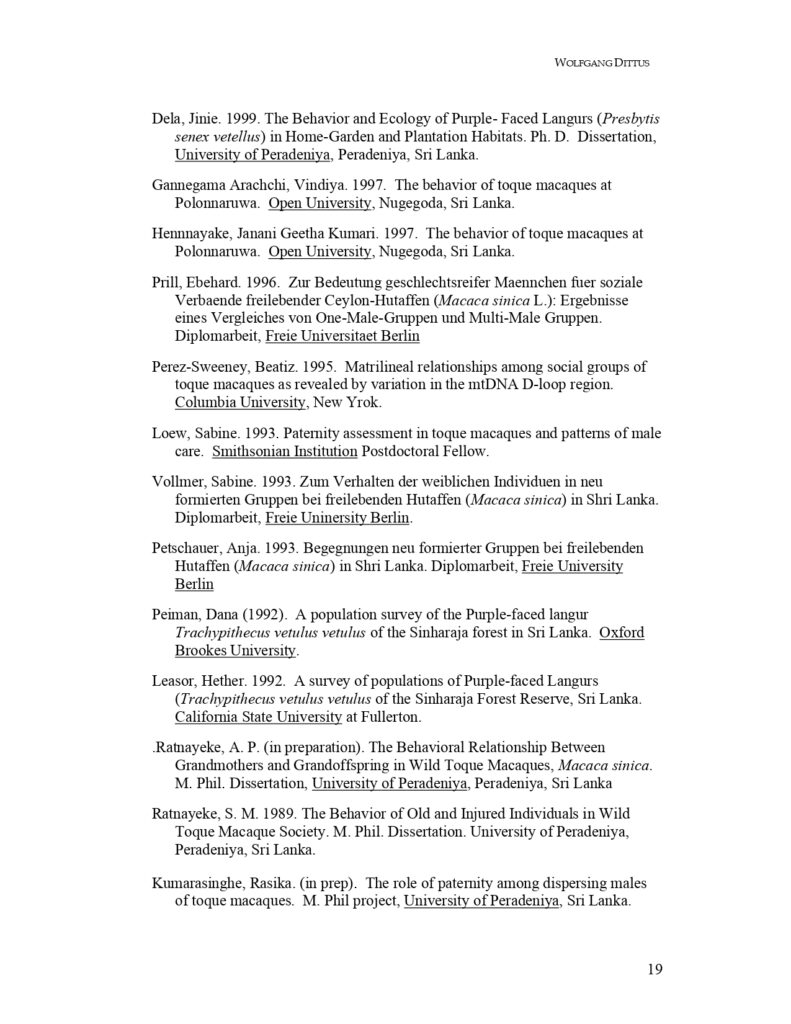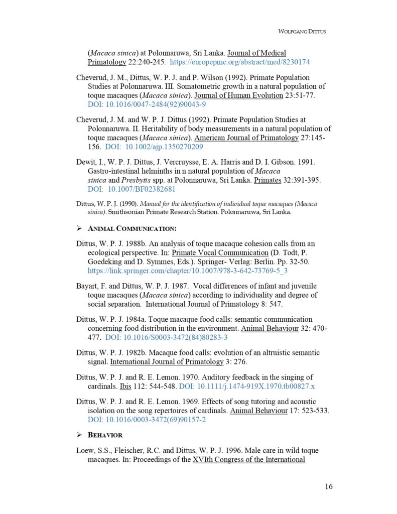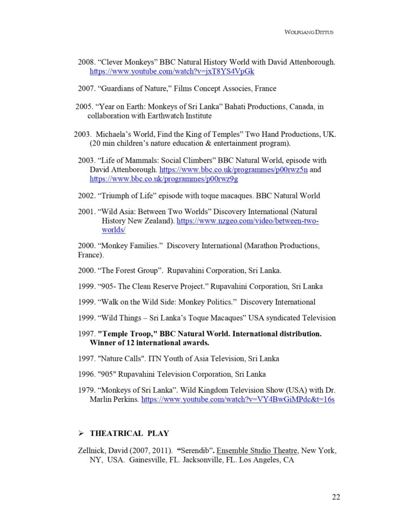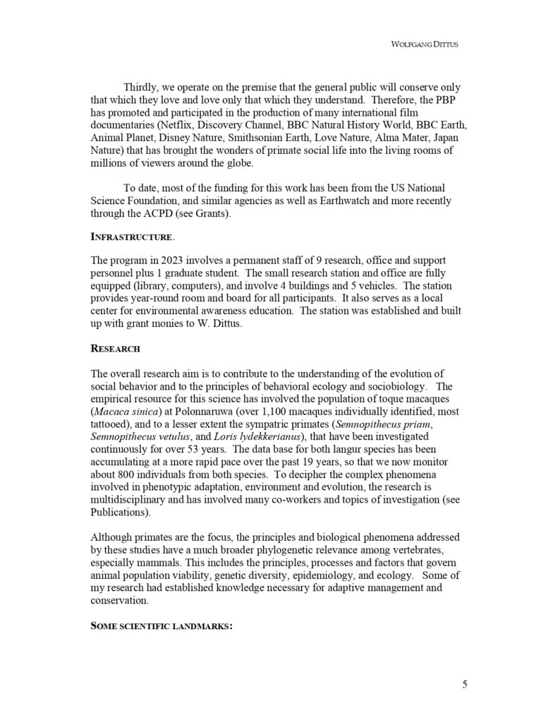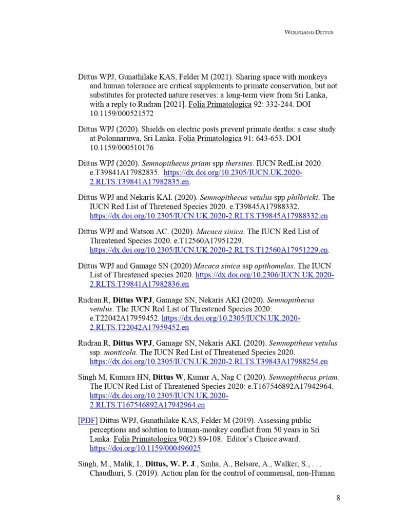 Through the Smithsonian Primate Biology Program (Sri Lanka) he aims to advance scientific knowledge for better understanding of the evolution of primate society and man’s place in nature, as well as for conserving wildlife. It provides insights of the many-sided nature of primate adaptations and the environmental context in which they evolved. The studies involve many collaborators from different disciplines, and have been ongoing continuously for over 54 years at a site of natural dry evergreen forest, the Polonnaruwa Nature Sanctuary and Archaeological Reserve, in the dry zone of Sri Lanka. Studies span the four sympatric primates there: Toque Macaque (Macaca sinica), Gray Langur (Semnopithecus priam), Purple-faced Langur (S. vetulus), and Slender Loris (Loris lydekkerianus); and these species’ demography (births, deaths, emigrations) in relation to social behavior, ecology, environment, and other facets of life are monitored. Published topics include behavioral ecology, growth and development, morphology, population genetics, paternity, social behavior, vocal communication, forest ecology, epidemiology, physiology, and conservation among others. New scientific discoveries feature in publications, and outreach educational programs to local schools and institutions. More than 40 documentary films based on the studies reach global audiences and includes the movie theater film “Monkey Kingdom” (produced with Disney Nature), as well many TV productions on the BBC, Discovery, Animal Planet, Smithsonian Channel, Rupavahini, and others. To promote the programmer’s aims, Dr Dittus and colleagues have established a non-profit company, the Association for the Conservation of Primate Diversity. See details of research program, publications and media outputs on the website www.primates.lk.