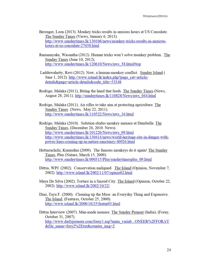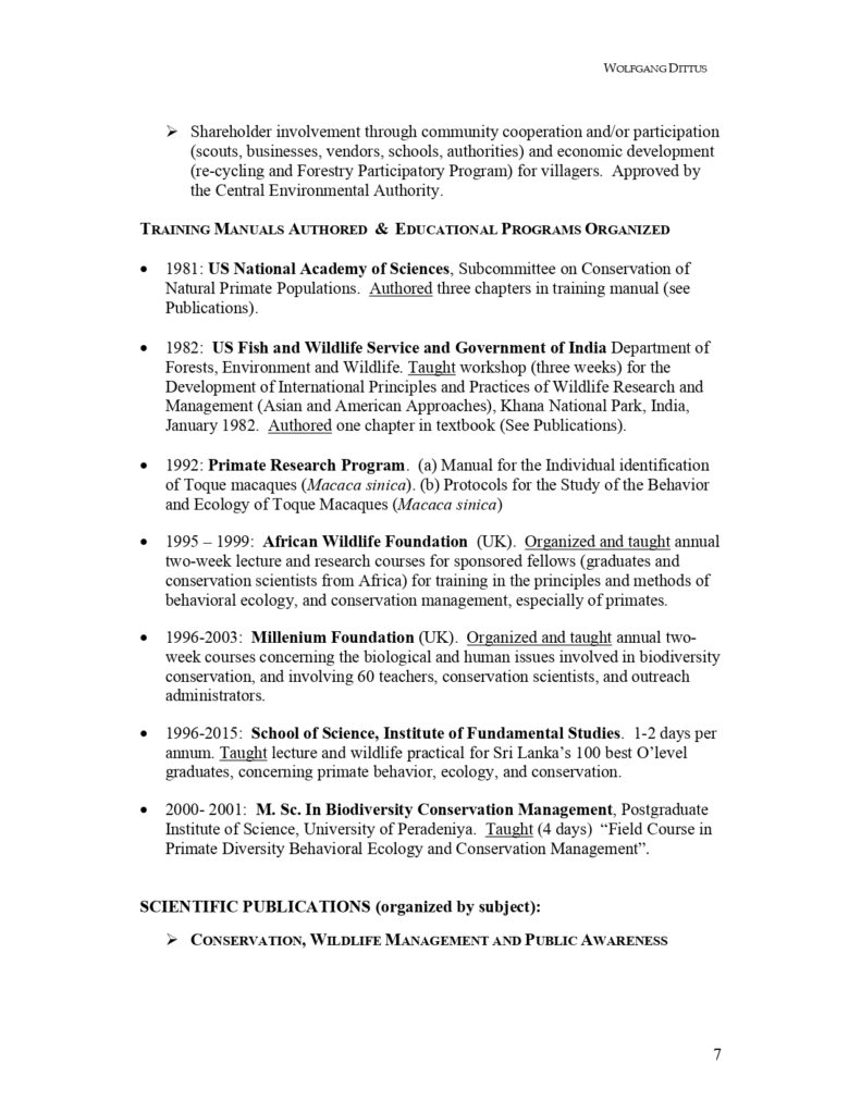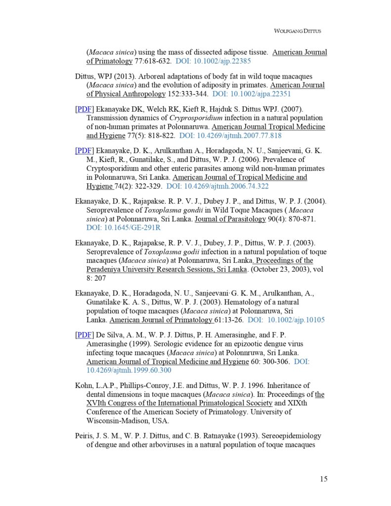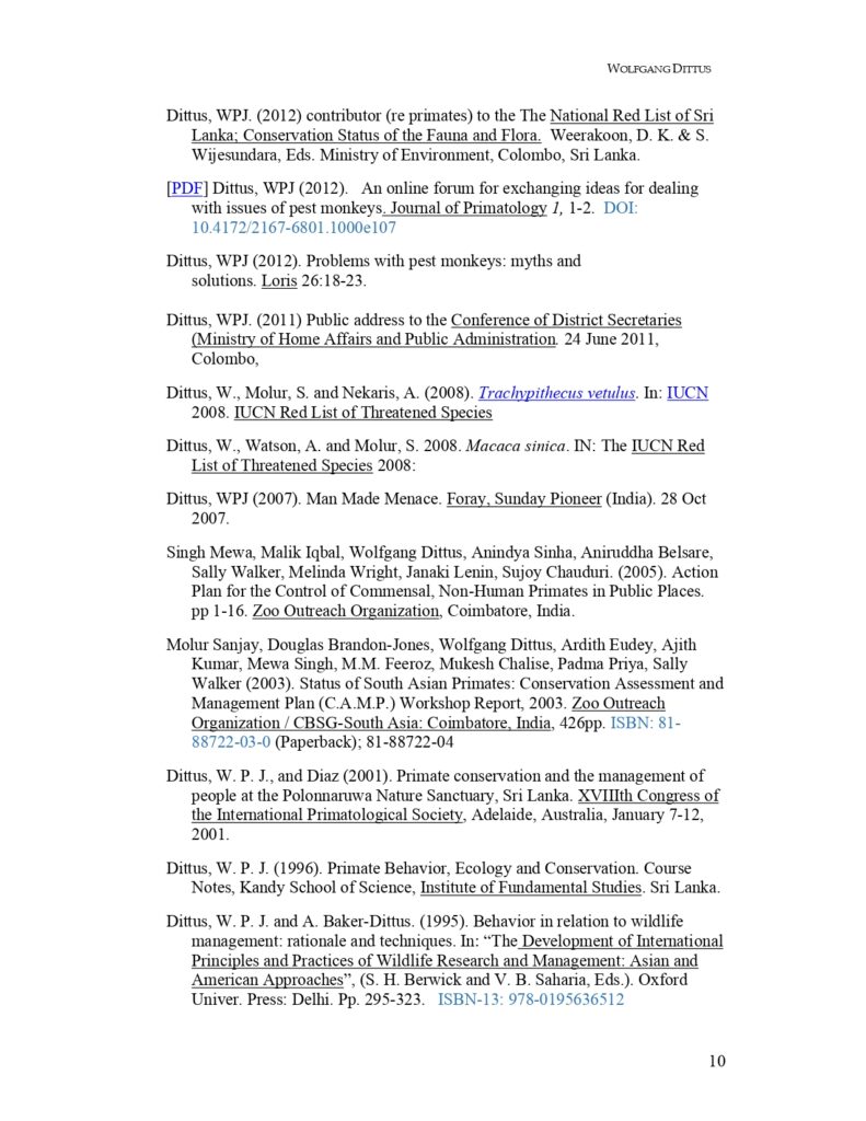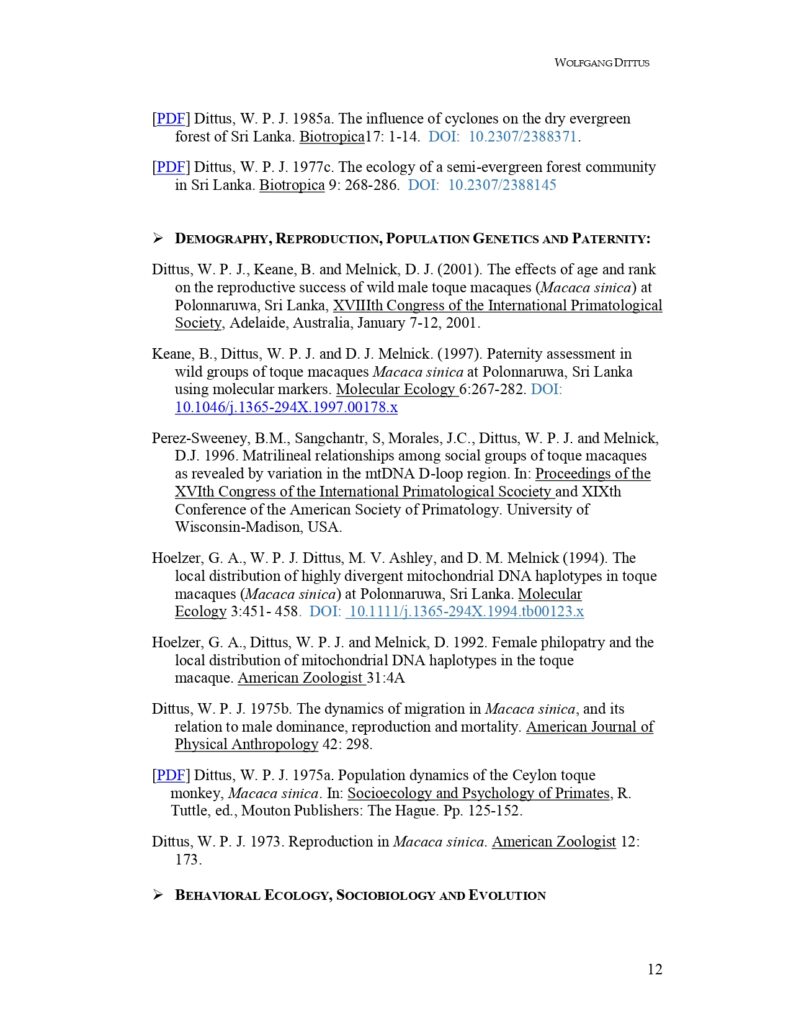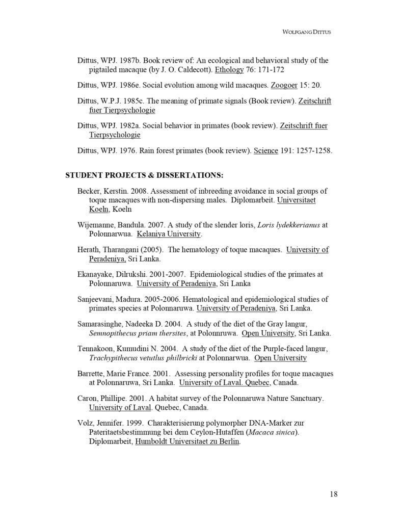 Through the Smithsonian Primate Biology Program (Sri Lanka) he aims to advance scientific knowledge for better understanding of the evolution of primate society and man’s place in nature, as well as for conserving wildlife. It provides insights of the many-sided nature of primate adaptations and the environmental context in which they evolved. The studies involve many collaborators from different disciplines, and have been ongoing continuously for over 54 years at a site of natural dry evergreen forest, the Polonnaruwa Nature Sanctuary and Archaeological Reserve, in the dry zone of Sri Lanka. Studies span the four sympatric primates there: Toque Macaque (Macaca sinica), Gray Langur (Semnopithecus priam), Purple-faced Langur (S. vetulus), and Slender Loris (Loris lydekkerianus); and these species’ demography (births, deaths, emigrations) in relation to social behavior, ecology, environment, and other facets of life are monitored. Published topics include behavioral ecology, growth and development, morphology, population genetics, paternity, social behavior, vocal communication, forest ecology, epidemiology, physiology, and conservation among others. New scientific discoveries feature in publications, and outreach educational programs to local schools and institutions. More than 40 documentary films based on the studies reach global audiences and includes the movie theater film “Monkey Kingdom” (produced with Disney Nature), as well many TV productions on the BBC, Discovery, Animal Planet, Smithsonian Channel, Rupavahini, and others. To promote the programmer’s aims, Dr Dittus and colleagues have established a non-profit company, the Association for the Conservation of Primate Diversity. See details of research program, publications and media outputs on the website www.primates.lk.